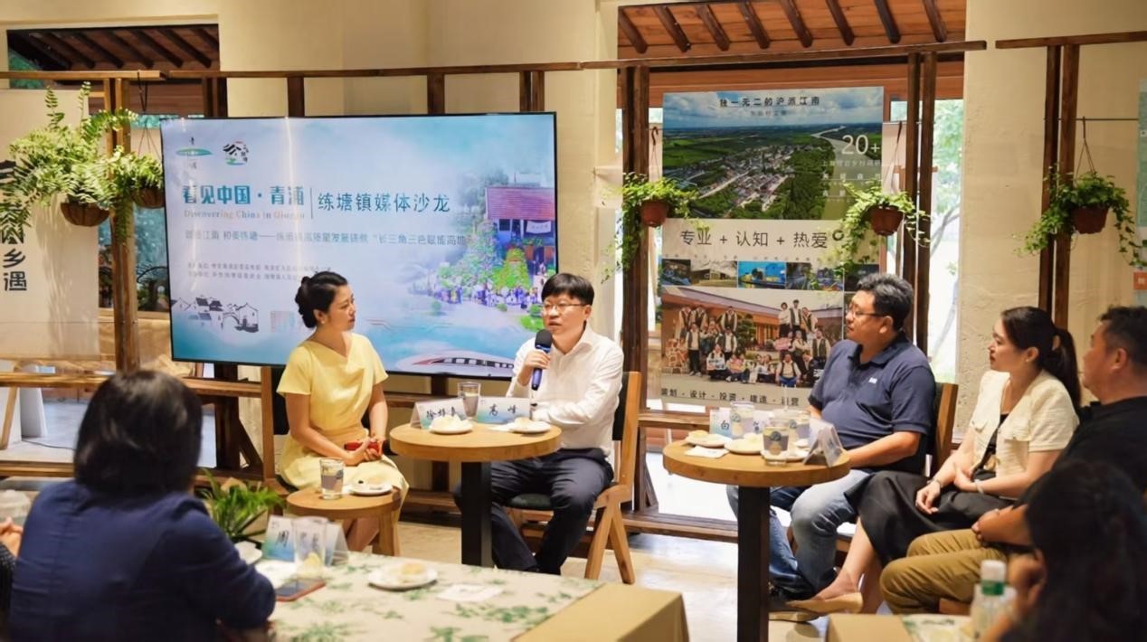9月12日,由青浦区委宣传部、青浦区人民政府新闻办公室、上海人民广播电台、青浦区练塘镇委员会、青浦区练塘镇人民政府联合开展的“看见中国·青浦 Discovering China in Qingpu”练塘镇媒体沙龙活动在东厍村满山乡村客厅举行。练塘镇党委副书记、镇长高峰;练塘镇城市推荐官,太北村党支部书记、村委会主任张欢峰;上海满山乡遇文化旅游发展有限公司CEO白俊熠;练塘镇旅游公司副总经理、和美综合网格站长张晨,与主持人徐梓嘉,围绕“新质江南,和美练塘——练塘镇高质量发展铸就‘长三角三色赋能高地’”主题,共话练塘在六业融合与和美乡村中的实践与未来。