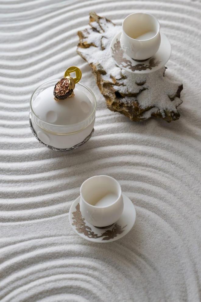 茶具的核心设计围绕“月”展开:当茶汤注入白瓷杯时,杯内会依次显现“新月→峨眉月→上弦月→盈凸月→满月”的动态变化,既呼应了中秋“月满人和”的核心意象,也让“圆满”的祈愿从抽象变为具象。在品茗时,能直观感受到中秋的时序之美,让日常使用也充满节日仪式感。